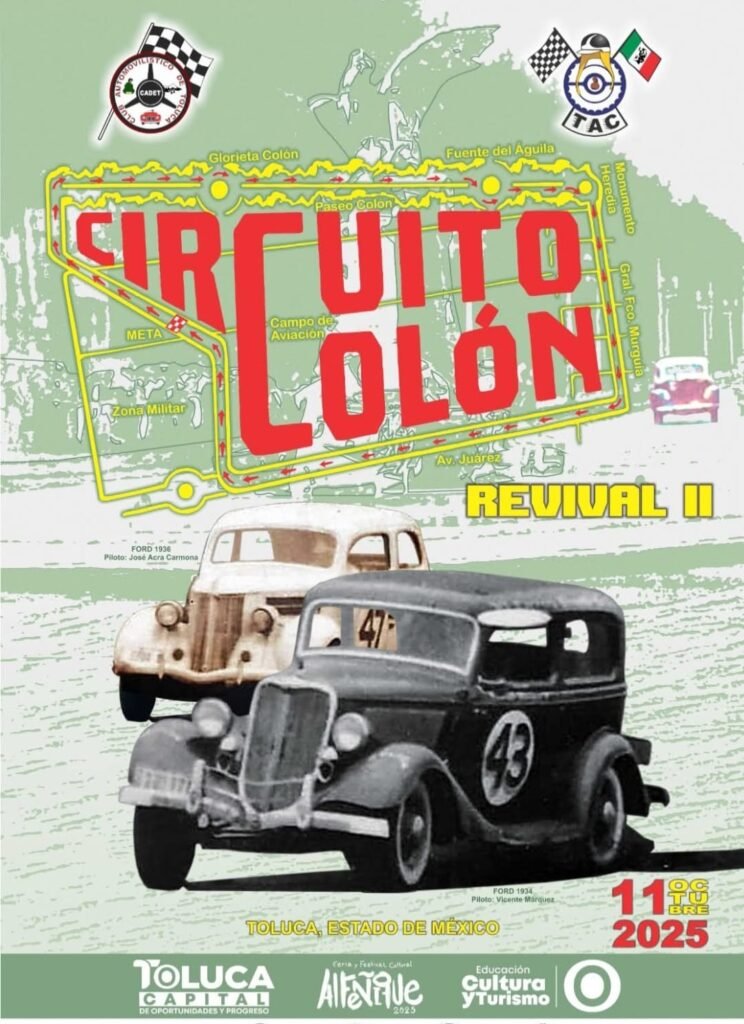 El circuito de autos clásicos en Toluca, se llevará a cabo el día 11 de octubre del 2025, y se tiene Planeado dar inicio a las 1:30 p.m. Sobre la glorieta de Colón y paseo Tollocan.