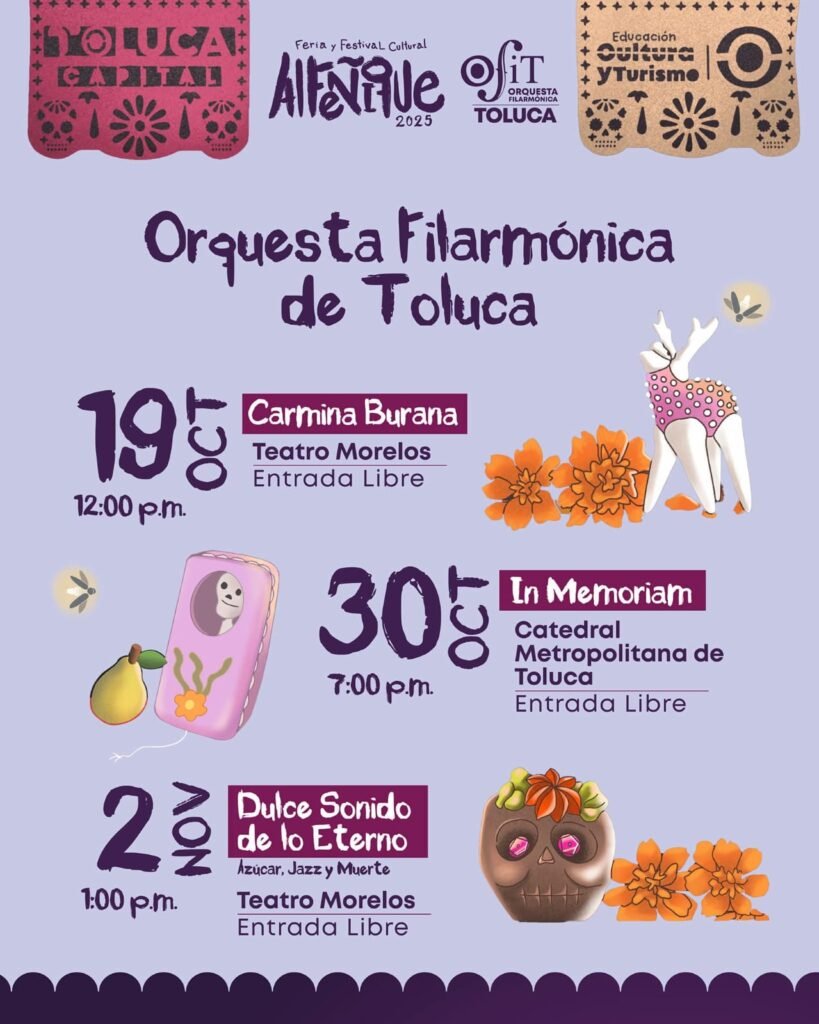 Durante el mes de octubre, y en la celebración de la feria del alfeñique 2025 en la ciudad de Toluca, la Orquesta Filarmónica de Toluca, dará una serie de 3 presentaciones especiales para celebrar esta festividad de gran relevancia y tradición en el Estado de México.